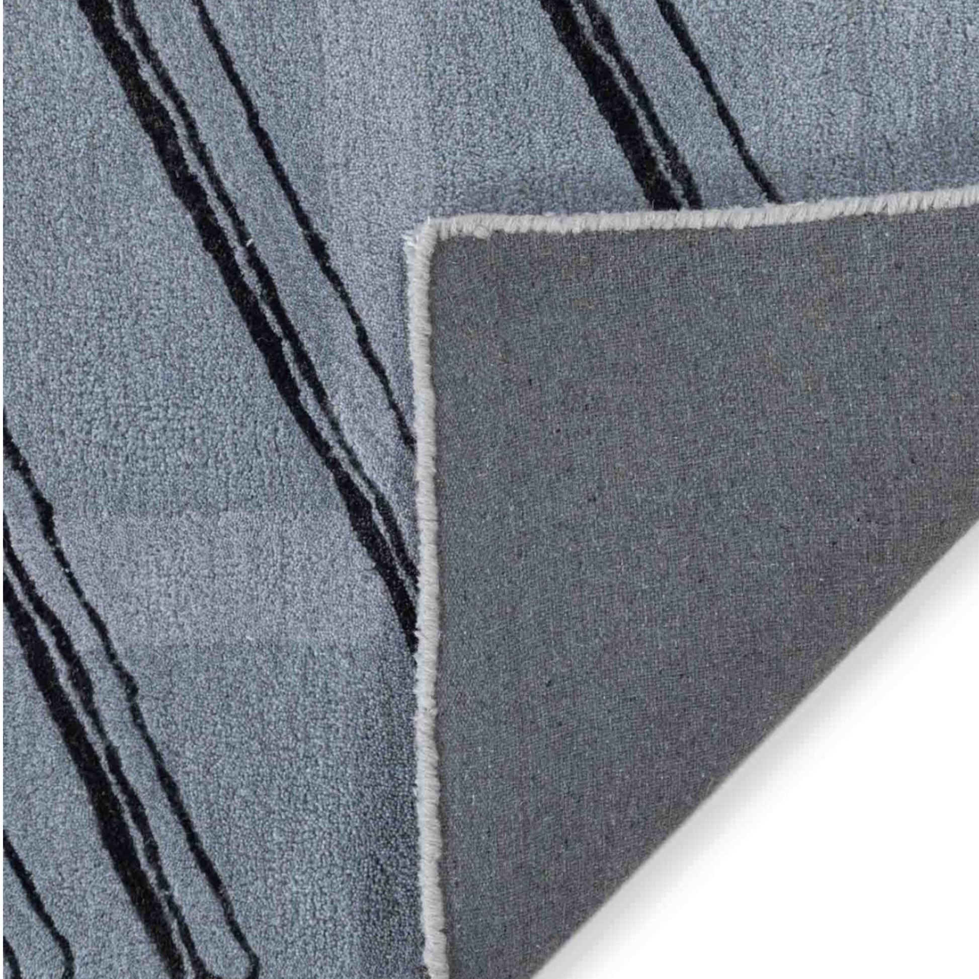Embrace motion and simplicity with the Indigo Loop Area Rug. A soft blue backdrop sets the stage for bold black arches and curved lines that create a visual rhythm reminiscent of architectural sketches or flowing handwriting. This modern abstract design adds depth without distraction, offering a playful yet refined accent to contemporary interiors.