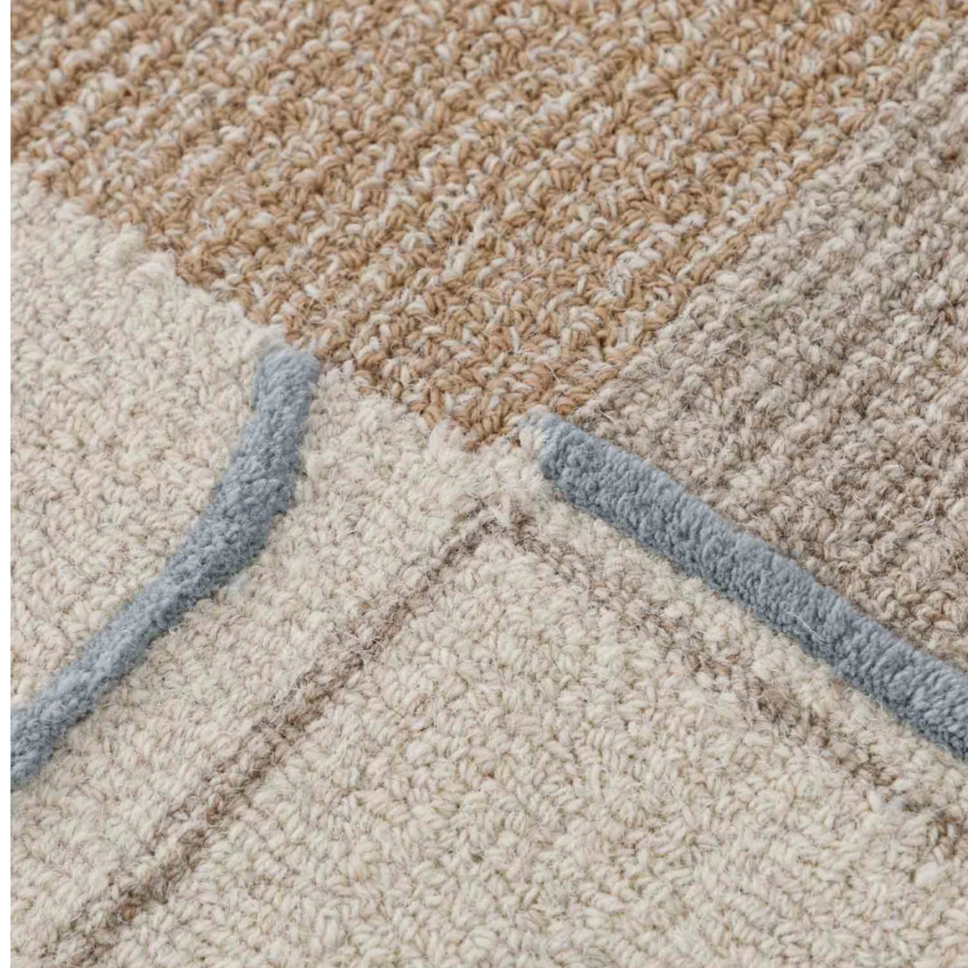 Add a clean, modern aesthetic to your space with this minimalist geometric area rug, featuring soft neutral tones of ivory, beige, and light grey accented with subtle blue outlines. The contemporary pattern of rounded rectangles and semi-circles creates visual interest without overwhelming your space.