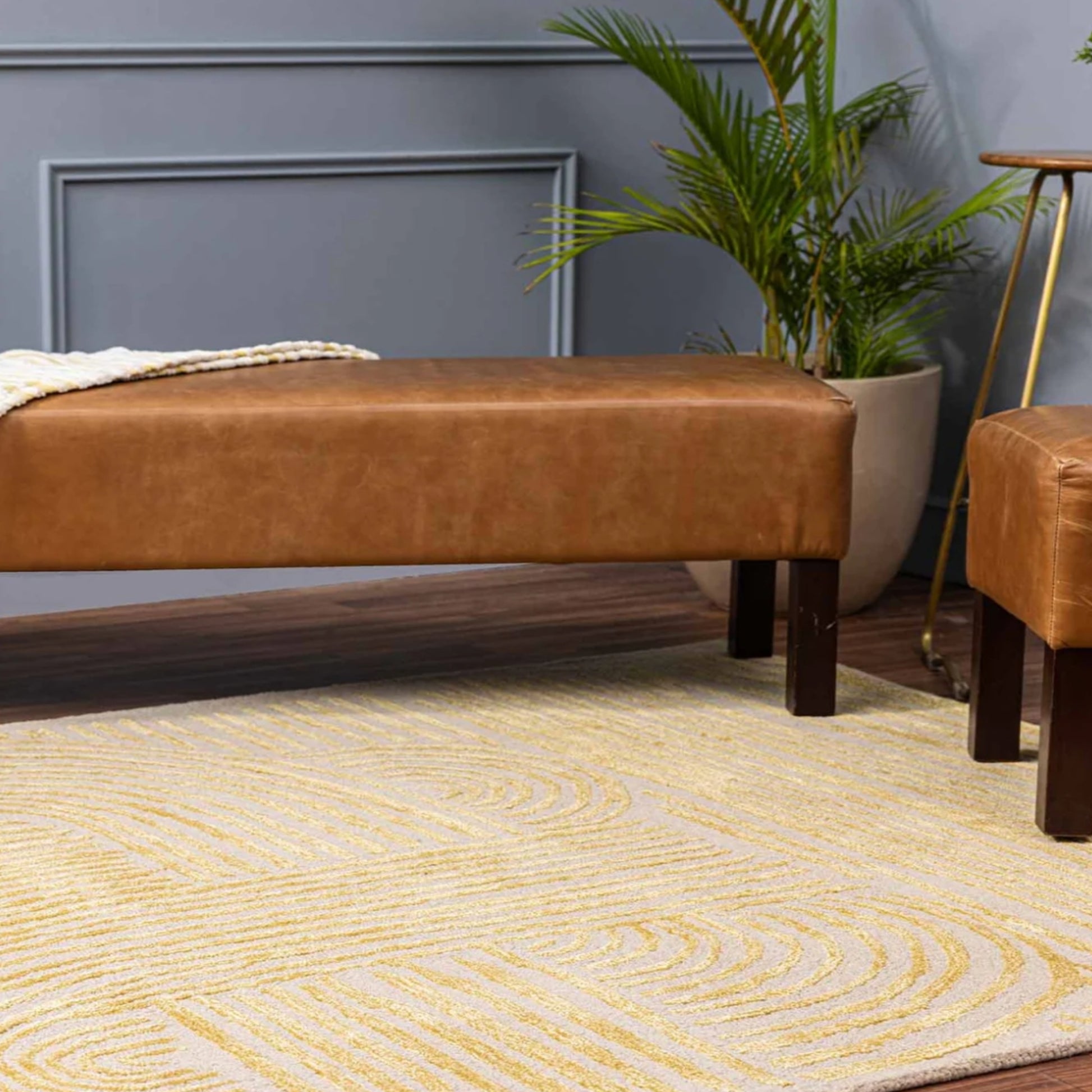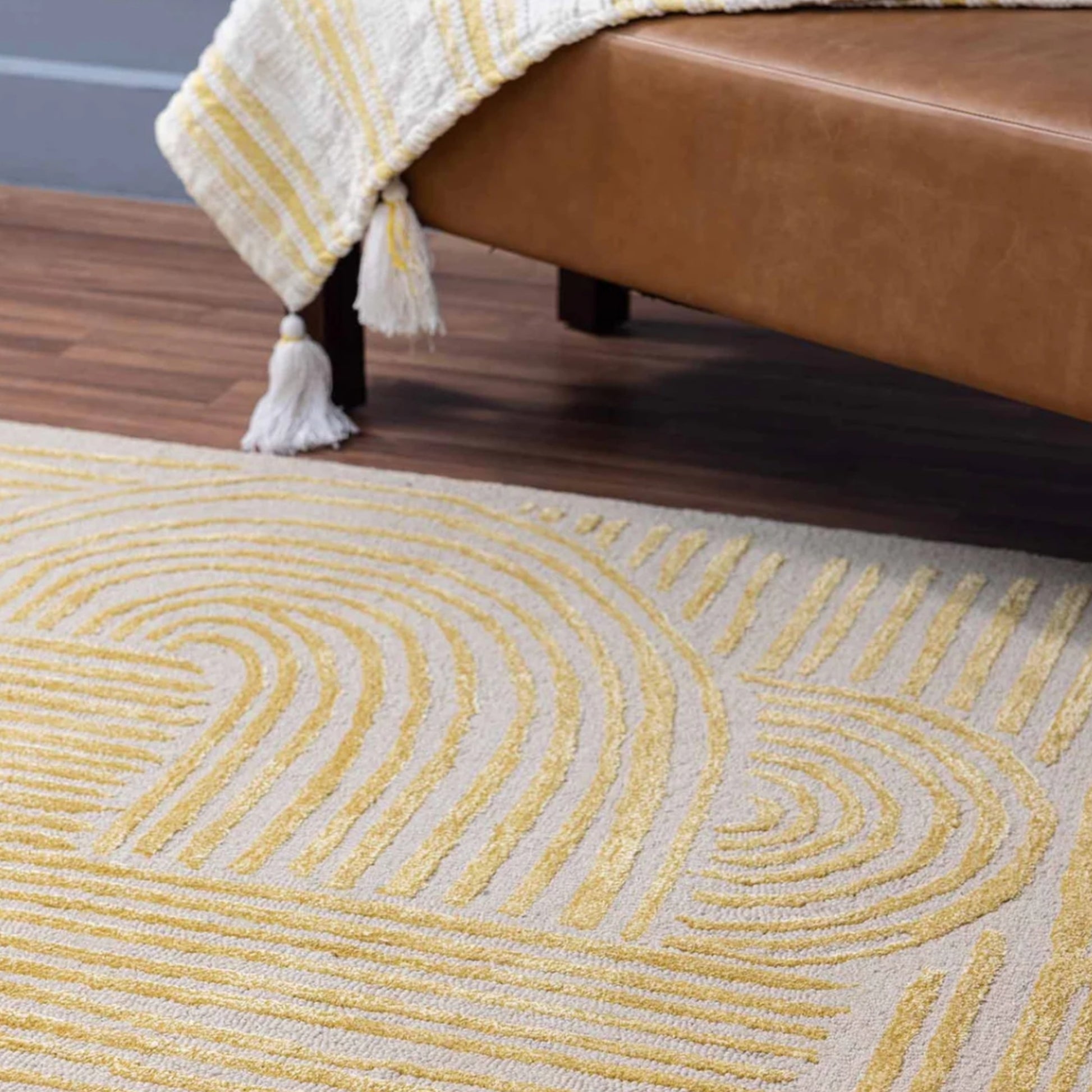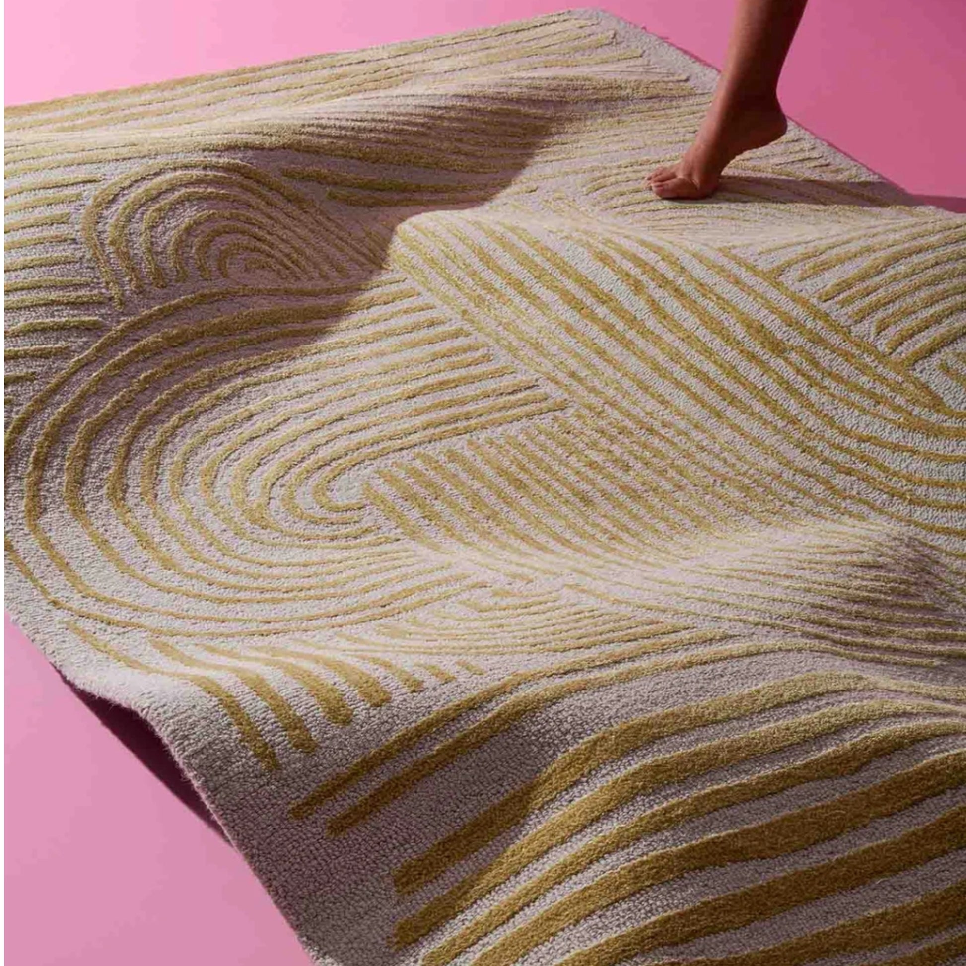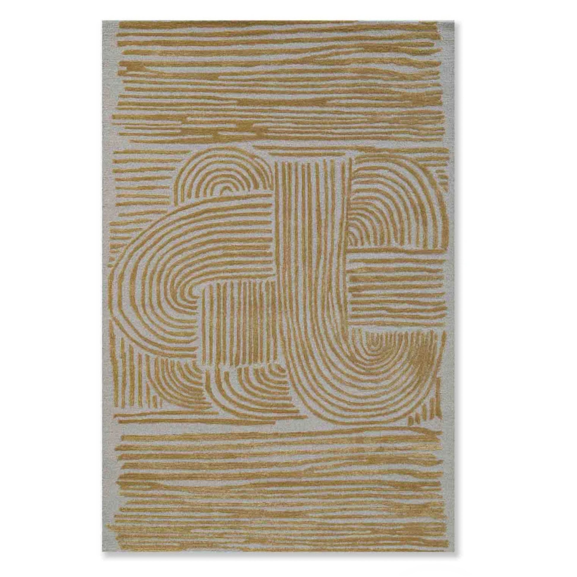 Introduce elegant geometry to your décor with the Golden Circuit Area Rug. Finely etched golden lines intertwine in symmetrical flow across a soft neutral base, creating a sense of calm movement and visual clarity. This modern abstract piece blends minimalist charm with artistic structure — perfect for spaces that value refined design.