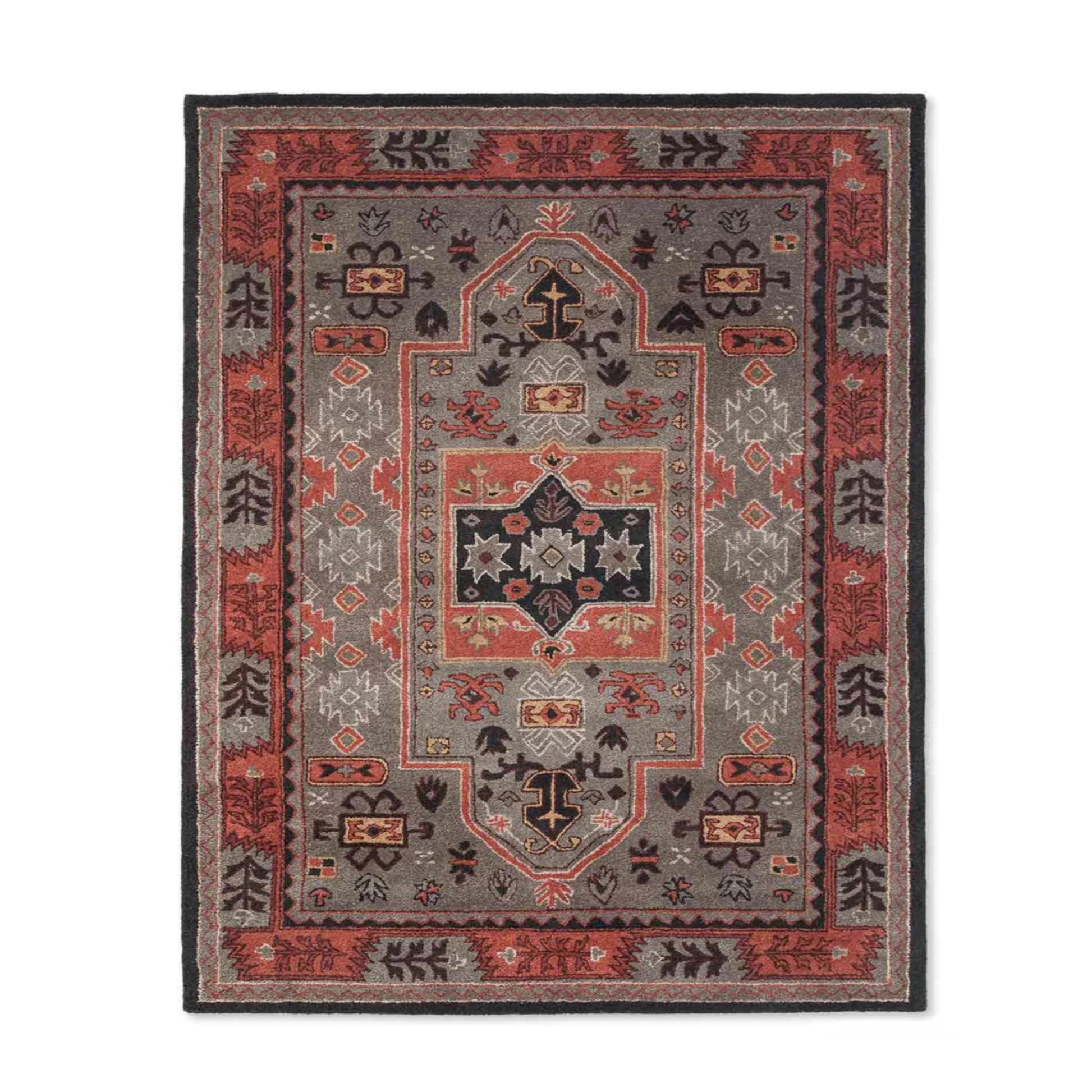 Rooted in heritage, the Crimson Bloom Persian Rug showcases a central floral medallion surrounded by detailed geometric vines, echoing centuries of artisanal tradition. Rich hues of red, black, and gray anchor its design, with ornate borders that frame each motif like a story preserved in textile. Whether laid beneath a grand dining table or gracing a serene reading nook, this rug adds cultural depth and timeless beauty to any interior.